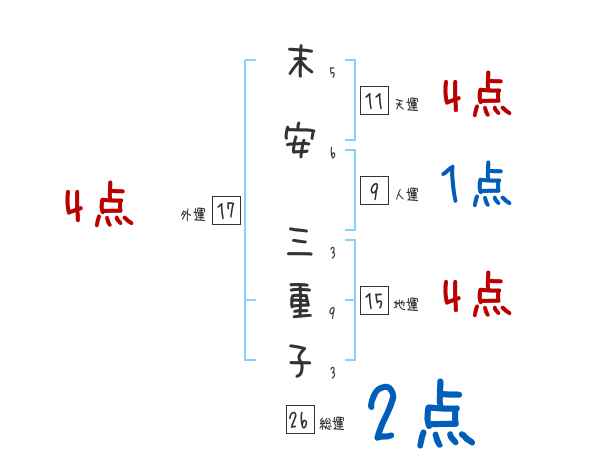 天運![]() | 末安三重子さんの天運は11画の4つ星!着実に富や地位を得る幸運な人生。 家系が持つ宿命的な運勢を表します。祖先から受け継いだ苗字ですので自分の力が及びません。家柄を象徴します。 |