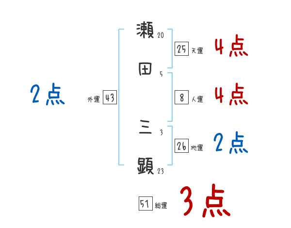 天運![]() | 瀬田三顕さんの天運は25画の4つ星!個性があり才能があふれる。強運の持ち主で発展する。 家系が持つ宿命的な運勢を表します。祖先から受け継いだ苗字ですので自分の力が及びません。家柄を象徴します。 |