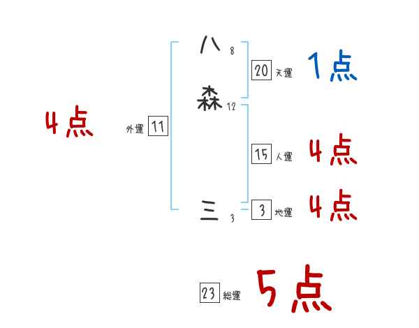 総運![]() | 八森三さんの総運は23画の5つ星!想像力に優れ活力がある。一代で成功し名誉を手に入れる。 あなたの人生を表す1番重要な運勢です。生涯を通じて影響する総合運となり、主に50歳以降の晩年期に影響を及ぼします。 |