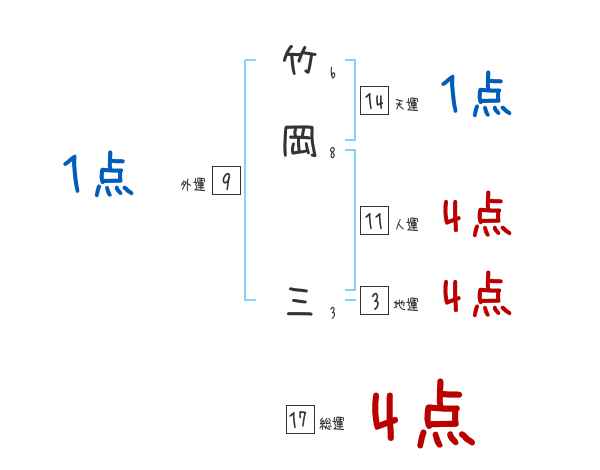 天運![]() | 竹岡三さんの天運は14画の1つ星!人に対して優しいがストレスを溜め込みがち。人間関係のトラブルを避けるよう気をつけましょう。 家系が持つ宿命的な運勢を表します。祖先から受け継いだ苗字ですので自分の力が及びません。家柄を象徴します。 |