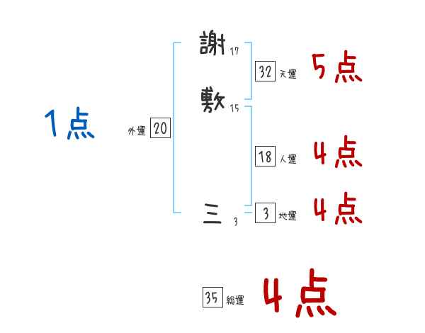 天運![]() | 謝敷三さんの天運は32画の5つ星!柔軟性があり成功する。チャンスが多く金運が良い。 家系が持つ宿命的な運勢を表します。祖先から受け継いだ苗字ですので自分の力が及びません。家柄を象徴します。 |