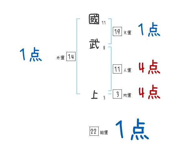 総運![]() | 國武上さんの総運は22画の1つ星!努力することが苦手ないっぽう手先が器用。芸術性にも優れる。 あなたの人生を表す1番重要な運勢です。生涯を通じて影響する総合運となり、主に50歳以降の晩年期に影響を及ぼします。 |