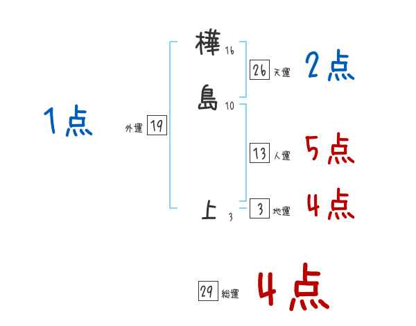 天運![]() | 樺島上さんの天運は26画の2つ星!波瀾万丈かも。信頼できる人を大事にしましょう。 家系が持つ宿命的な運勢を表します。祖先から受け継いだ苗字ですので自分の力が及びません。家柄を象徴します。 |