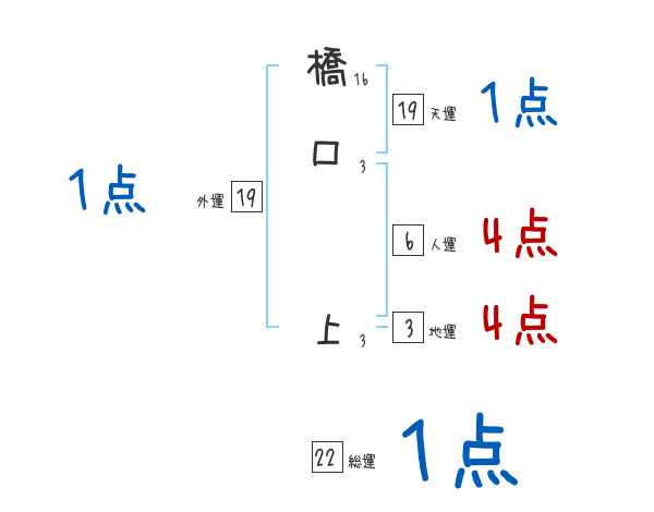 天運![]() | 橋口上さんの天運は19画の1つ星!優れた才能を持ちますが、協調性が足りないことも。周りの人と協力する事を意識しましょう。 家系が持つ宿命的な運勢を表します。祖先から受け継いだ苗字ですので自分の力が及びません。家柄を象徴します。 |