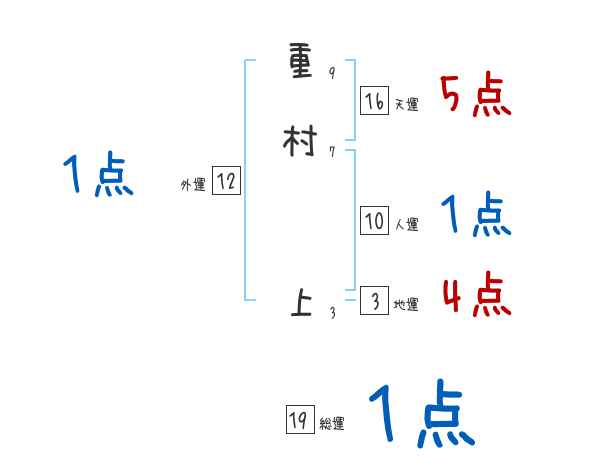 天運![]() | 重村上さんの天運は16画の5つ星!人望が厚く大きく発展する。逆転成功が見える。 家系が持つ宿命的な運勢を表します。祖先から受け継いだ苗字ですので自分の力が及びません。家柄を象徴します。 |
