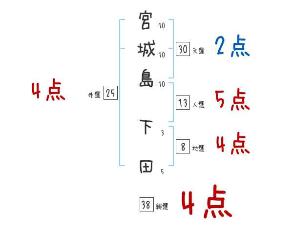 天運![]() | 宮城島下田さんの天運は30画の2つ星!浮き沈みの激しさに注意しましょう。 家系が持つ宿命的な運勢を表します。祖先から受け継いだ苗字ですので自分の力が及びません。家柄を象徴します。 |