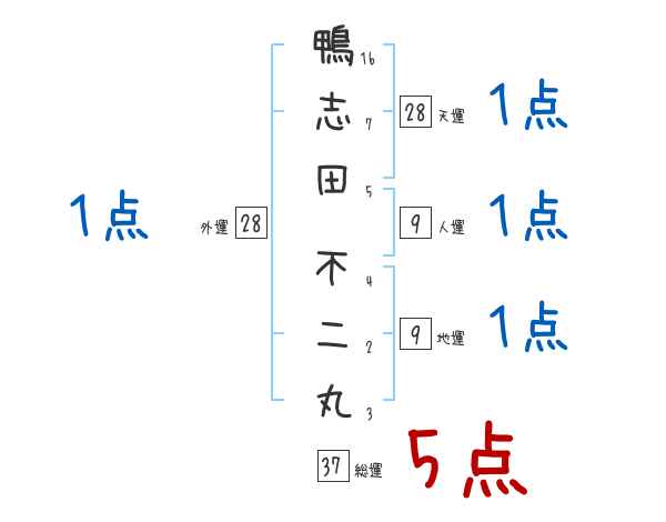 天運![]() | 鴨志田不二丸さんの天運は28画の1つ星!家庭環境に注意。スポーツで活躍できる能力があるかも。 家系が持つ宿命的な運勢を表します。祖先から受け継いだ苗字ですので自分の力が及びません。家柄を象徴します。 |