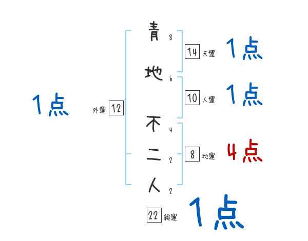 総運![]() | 青地不二人さんの総運は22画の1つ星!努力することが苦手ないっぽう手先が器用。芸術性にも優れる。 あなたの人生を表す1番重要な運勢です。生涯を通じて影響する総合運となり、主に50歳以降の晩年期に影響を及ぼします。 |