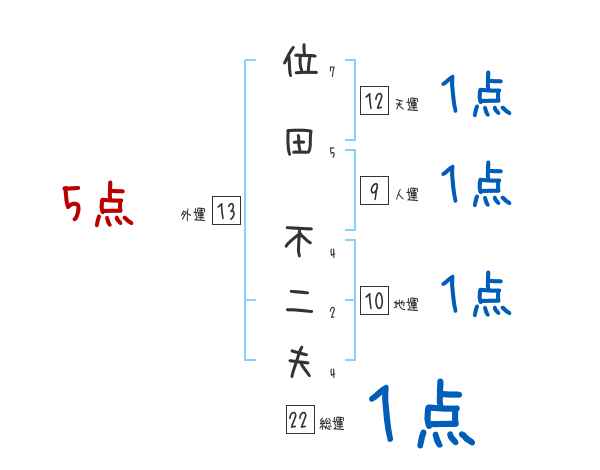 天運![]() | 位田不二夫さんの天運は12画の1つ星!簡単な失敗で諦めてしまいやすいかも。着実に行動すると良いでしょう。 家系が持つ宿命的な運勢を表します。祖先から受け継いだ苗字ですので自分の力が及びません。家柄を象徴します。 |