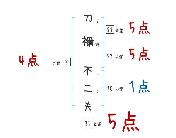 天運![]() | 刀禰不二夫さんの天運は21画の5つ星!統率力がある。独立し成功する。名誉を手に入れる。 家系が持つ宿命的な運勢を表します。祖先から受け継いだ苗字ですので自分の力が及びません。家柄を象徴します。 |