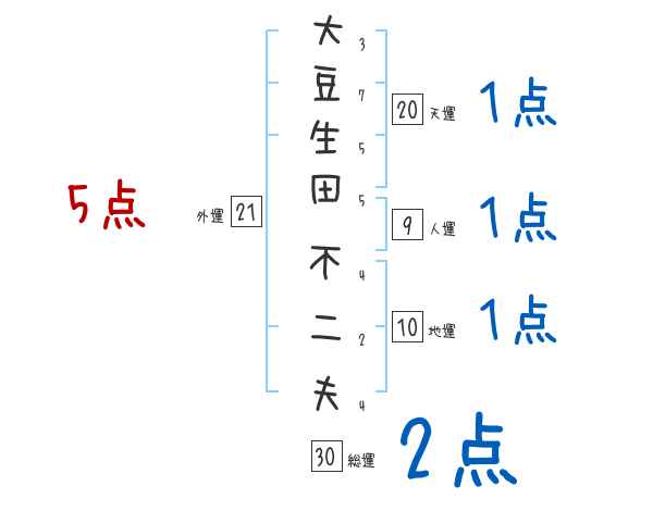 総運![]() | 大豆生田不二夫さんの総運は30画の2つ星!浮き沈みの激しさに注意しましょう。 あなたの人生を表す1番重要な運勢です。生涯を通じて影響する総合運となり、主に50歳以降の晩年期に影響を及ぼします。 |