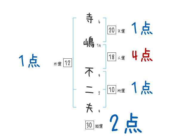 人運![]() | 寺嶋不二夫さんの人運は18画の4つ星!情熱的で剛気。忍耐力があり信頼される。 性格や才能などを表す2番目に重要な運勢です。人間関係や協調性、社会的な成功に影響します。主に20歳から50歳ぐらいまでの中年期の運勢を表します。 |