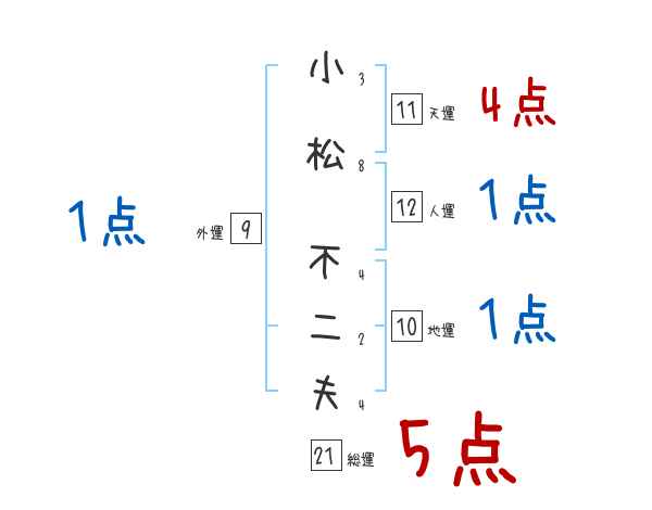 天運![]() | 小松不二夫さんの天運は11画の4つ星!着実に富や地位を得る幸運な人生。 家系が持つ宿命的な運勢を表します。祖先から受け継いだ苗字ですので自分の力が及びません。家柄を象徴します。 |