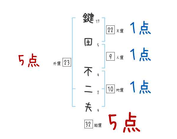 総運![]() | 鍵田不二夫さんの総運は32画の5つ星!柔軟性があり成功する。チャンスが多く金運が良い。 あなたの人生を表す1番重要な運勢です。生涯を通じて影響する総合運となり、主に50歳以降の晩年期に影響を及ぼします。 |