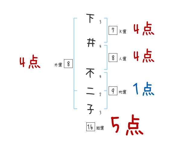 天運![]() | 下井不二子さんの天運は7画の4つ星!強い意志や信念を持ち独立心が強い。自立する。 家系が持つ宿命的な運勢を表します。祖先から受け継いだ苗字ですので自分の力が及びません。家柄を象徴します。 |