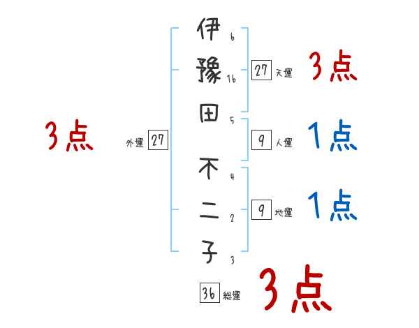 総運![]() | 伊豫田不二子さんの総運は36画の3つ星!先見性が豊かです。多少神経質で苦労することも。 あなたの人生を表す1番重要な運勢です。生涯を通じて影響する総合運となり、主に50歳以降の晩年期に影響を及ぼします。 |