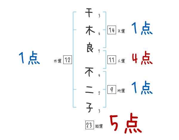 総運![]() | 千木良不二子さんの総運は23画の5つ星!想像力に優れ活力がある。一代で成功し名誉を手に入れる。 あなたの人生を表す1番重要な運勢です。生涯を通じて影響する総合運となり、主に50歳以降の晩年期に影響を及ぼします。 |