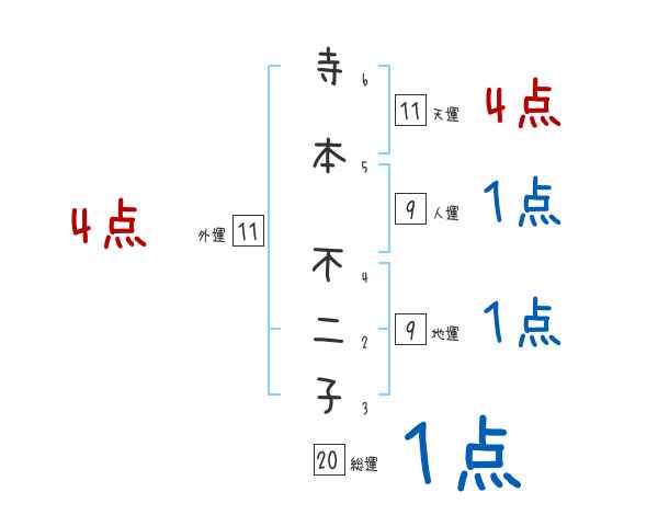 天運![]() | 寺本不二子さんの天運は11画の4つ星!着実に富や地位を得る幸運な人生。 家系が持つ宿命的な運勢を表します。祖先から受け継いだ苗字ですので自分の力が及びません。家柄を象徴します。 |