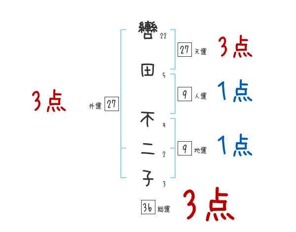 外運![]() | 轡田不二子さんの外運は27画の3つ星!頭脳明晰だが強情で摩擦が多い傾向。孤立に注意。 生活面を象徴する運勢です。外部から受ける影響力を表し、結婚運、家庭運や職場、環境への順応性を表します。 |