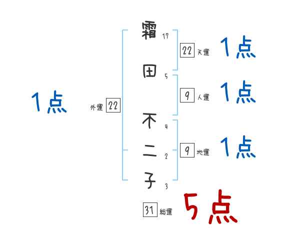 外運![]() | 霜田不二子さんの外運は22画の1つ星!努力することが苦手ないっぽう手先が器用。芸術性にも優れる。 生活面を象徴する運勢です。外部から受ける影響力を表し、結婚運、家庭運や職場、環境への順応性を表します。 |