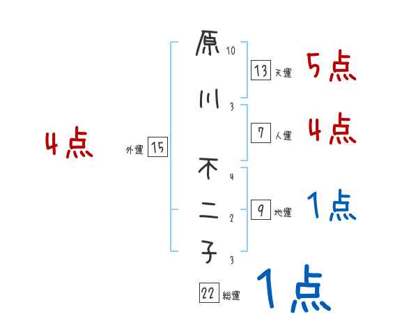 天運![]() | 原川不二子さんの天運は13画の5つ星!才能に恵まれ人気がある。名声を手に入れる。円満な人生。 家系が持つ宿命的な運勢を表します。祖先から受け継いだ苗字ですので自分の力が及びません。家柄を象徴します。 |