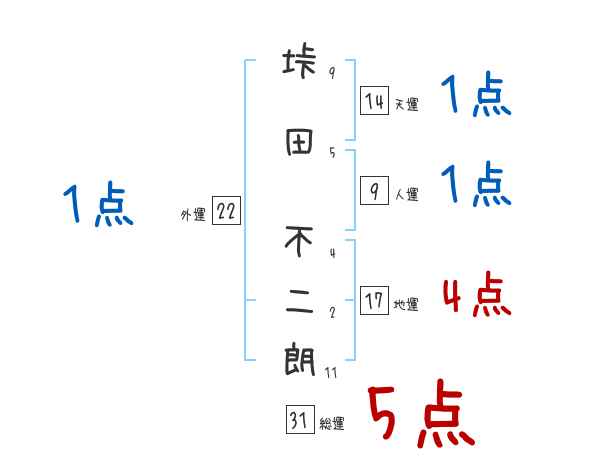 外運![]() | 垰田不二朗さんの外運は22画の1つ星!努力することが苦手ないっぽう手先が器用。芸術性にも優れる。 生活面を象徴する運勢です。外部から受ける影響力を表し、結婚運、家庭運や職場、環境への順応性を表します。 |
