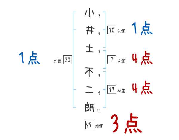 人運![]() | 小井土不二朗さんの人運は7画の4つ星!強い意志や信念を持ち独立心が強い。自立する。 性格や才能などを表す2番目に重要な運勢です。人間関係や協調性、社会的な成功に影響します。主に20歳から50歳ぐらいまでの中年期の運勢を表します。 |