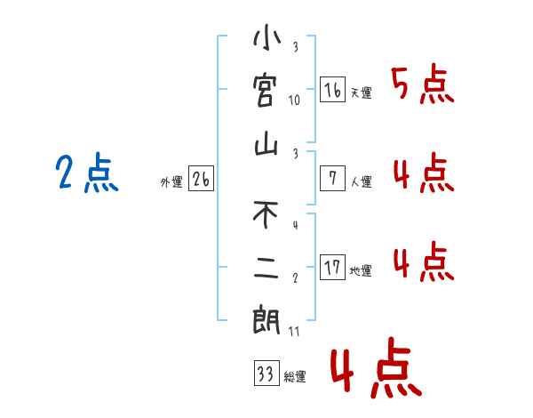 天運![]() | 小宮山不二朗さんの天運は16画の5つ星!人望が厚く大きく発展する。逆転成功が見える。 家系が持つ宿命的な運勢を表します。祖先から受け継いだ苗字ですので自分の力が及びません。家柄を象徴します。 |