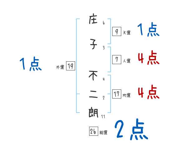 天運![]() | 庄子不二朗さんの天運は9画の1つ星!消極的で才能を発揮することが苦手なことも。周りの意見に耳を傾けましょう。 家系が持つ宿命的な運勢を表します。祖先から受け継いだ苗字ですので自分の力が及びません。家柄を象徴します。 |