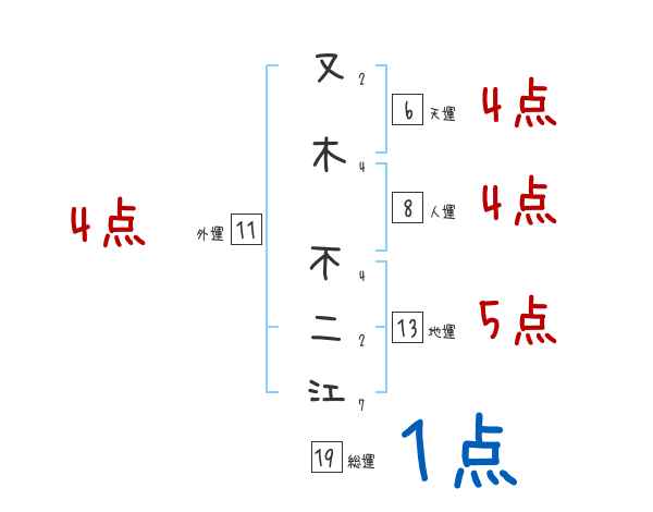 総運![]() | 又木不二江さんの総運は19画の1つ星!優れた才能を持ちますが、協調性が足りないことも。周りの人と協力する事を意識しましょう。 あなたの人生を表す1番重要な運勢です。生涯を通じて影響する総合運となり、主に50歳以降の晩年期に影響を及ぼします。 |