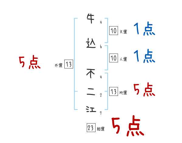 天運![]() | 牛込不二江さんの天運は10画の1つ星!不安を感じやすい傾向。ストレスを抱えないように注意しましょう。 家系が持つ宿命的な運勢を表します。祖先から受け継いだ苗字ですので自分の力が及びません。家柄を象徴します。 |