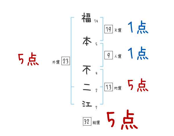 総運![]() | 福本不二江さんの総運は32画の5つ星!柔軟性があり成功する。チャンスが多く金運が良い。 あなたの人生を表す1番重要な運勢です。生涯を通じて影響する総合運となり、主に50歳以降の晩年期に影響を及ぼします。 |