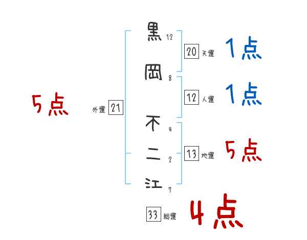 外運![]() | 黒岡不二江さんの外運は21画の5つ星!統率力がある。独立し成功する。名誉を手に入れる。 生活面を象徴する運勢です。外部から受ける影響力を表し、結婚運、家庭運や職場、環境への順応性を表します。 |