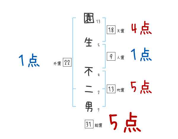 天運![]() | 園生不二男さんの天運は18画の4つ星!情熱的で剛気。忍耐力があり信頼される。 家系が持つ宿命的な運勢を表します。祖先から受け継いだ苗字ですので自分の力が及びません。家柄を象徴します。 |