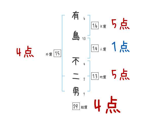 天運![]() | 有島不二男さんの天運は16画の5つ星!人望が厚く大きく発展する。逆転成功が見える。 家系が持つ宿命的な運勢を表します。祖先から受け継いだ苗字ですので自分の力が及びません。家柄を象徴します。 |