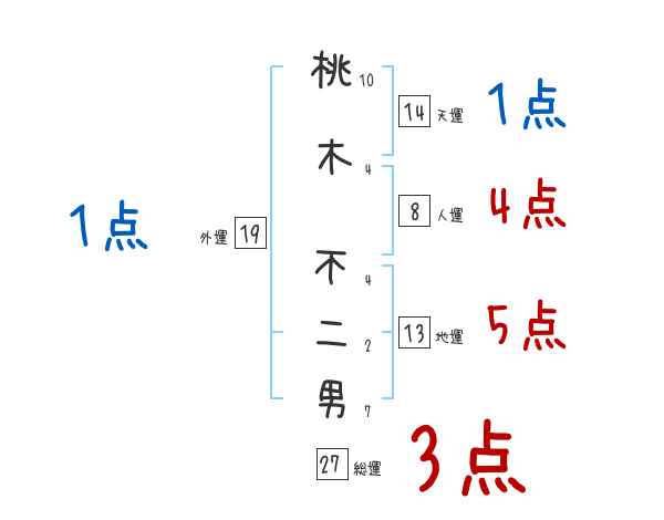 総運![]() | 桃木不二男さんの総運は27画の3つ星!頭脳明晰だが強情で摩擦が多い傾向。孤立に注意。 あなたの人生を表す1番重要な運勢です。生涯を通じて影響する総合運となり、主に50歳以降の晩年期に影響を及ぼします。 |