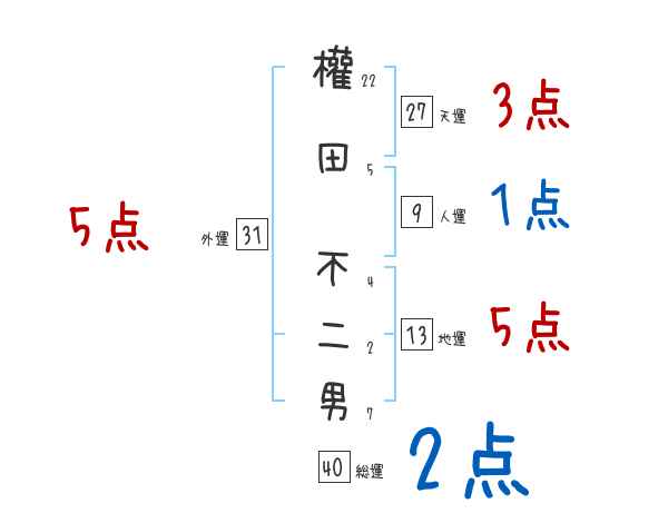 天運![]() | 權田不二男さんの天運は27画の3つ星!頭脳明晰だが強情で摩擦が多い傾向。孤立に注意。 家系が持つ宿命的な運勢を表します。祖先から受け継いだ苗字ですので自分の力が及びません。家柄を象徴します。 |