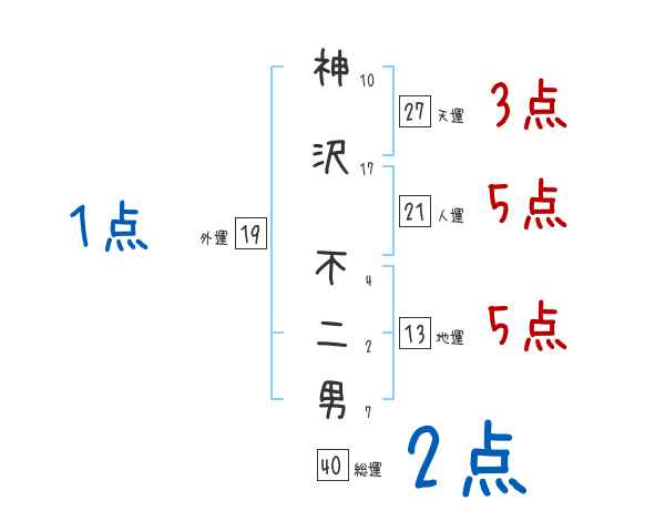 外運![]() | 神沢不二男さんの外運は19画の1つ星!優れた才能を持ちますが、協調性が足りないことも。周りの人と協力する事を意識しましょう。 生活面を象徴する運勢です。外部から受ける影響力を表し、結婚運、家庭運や職場、環境への順応性を表します。 |