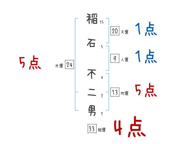 外運![]() | 稲石不二男さんの外運は24画の5つ星!家庭運が良く順調な人生。金運にも恵まれる。 生活面を象徴する運勢です。外部から受ける影響力を表し、結婚運、家庭運や職場、環境への順応性を表します。 |