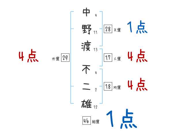 天運![]() | 中野渡不二雄さんの天運は28画の1つ星!家庭環境に注意。スポーツで活躍できる能力があるかも。 家系が持つ宿命的な運勢を表します。祖先から受け継いだ苗字ですので自分の力が及びません。家柄を象徴します。 |