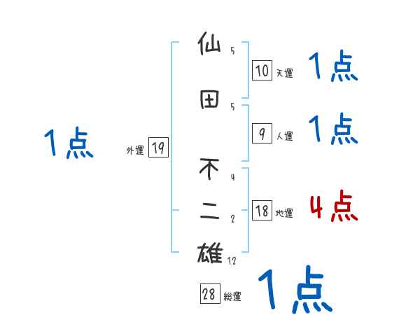 天運![]() | 仙田不二雄さんの天運は10画の1つ星!不安を感じやすい傾向。ストレスを抱えないように注意しましょう。 家系が持つ宿命的な運勢を表します。祖先から受け継いだ苗字ですので自分の力が及びません。家柄を象徴します。 |