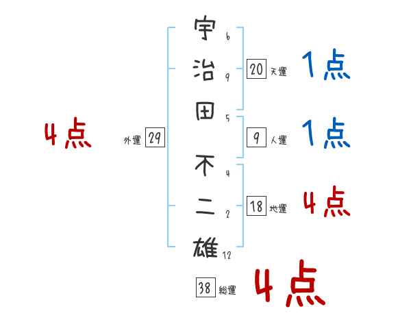 外運![]() | 宇治田不二雄さんの外運は29画の4つ星!完全主義で才能がある。厳格な心の持ち主。 生活面を象徴する運勢です。外部から受ける影響力を表し、結婚運、家庭運や職場、環境への順応性を表します。 |