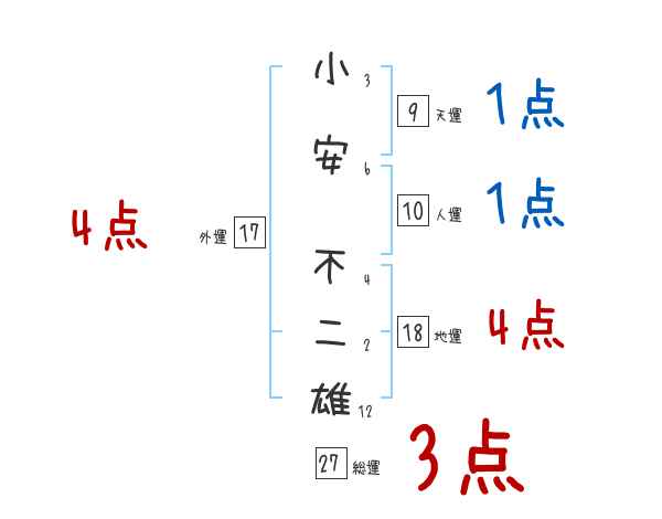外運![]() | 小安不二雄さんの外運は17画の4つ星!積極的な行動力。地位を気づき財産を手に入れる。純粋な心と直感力。 生活面を象徴する運勢です。外部から受ける影響力を表し、結婚運、家庭運や職場、環境への順応性を表します。 |