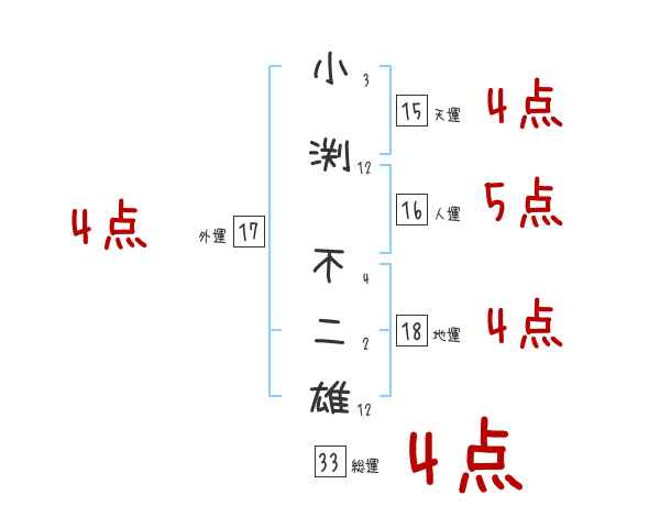 外運![]() | 小渕不二雄さんの外運は17画の4つ星!積極的な行動力。地位を気づき財産を手に入れる。純粋な心と直感力。 生活面を象徴する運勢です。外部から受ける影響力を表し、結婚運、家庭運や職場、環境への順応性を表します。 |