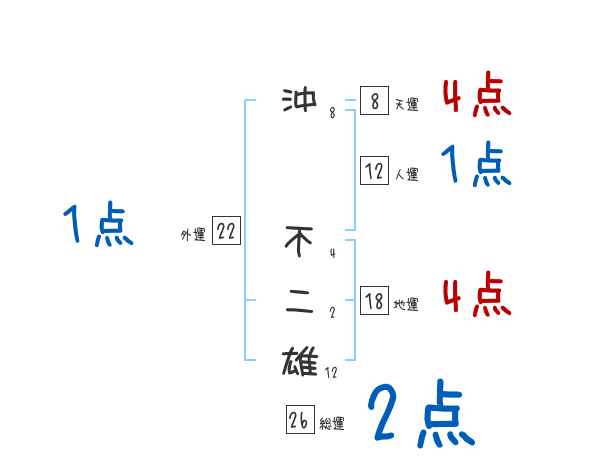 天運![]() | 沖不二雄さんの天運は8画の4つ星!勤勉家。根気強く努力し成功する。忍耐力がある。 家系が持つ宿命的な運勢を表します。祖先から受け継いだ苗字ですので自分の力が及びません。家柄を象徴します。 |