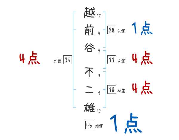 外運![]() | 越前谷不二雄さんの外運は35画の4つ星!温厚な性格で感受性が高い。穏和な性格で人望が厚い。 生活面を象徴する運勢です。外部から受ける影響力を表し、結婚運、家庭運や職場、環境への順応性を表します。 |