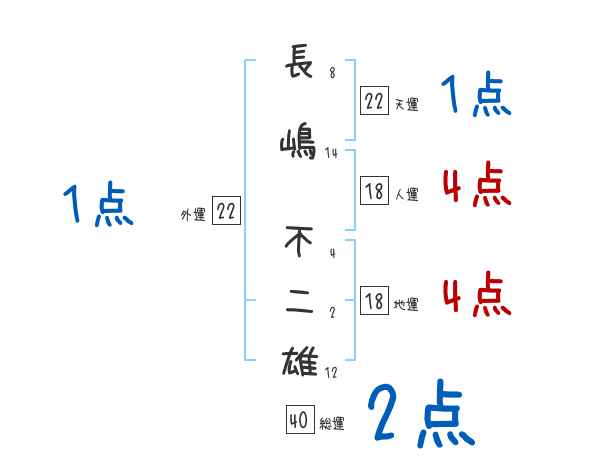天運![]() | 長嶋不二雄さんの天運は22画の1つ星!努力することが苦手ないっぽう手先が器用。芸術性にも優れる。 家系が持つ宿命的な運勢を表します。祖先から受け継いだ苗字ですので自分の力が及びません。家柄を象徴します。 |
