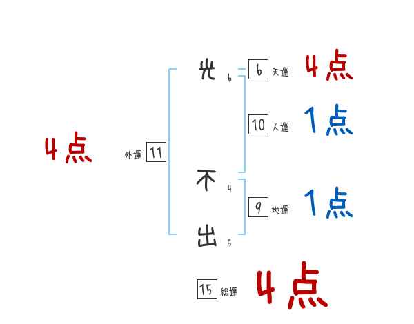 人運![]() | 光不出さんの人運は10画の1つ星!不安を感じやすい傾向。ストレスを抱えないように注意しましょう。 性格や才能などを表す2番目に重要な運勢です。人間関係や協調性、社会的な成功に影響します。主に20歳から50歳ぐらいまでの中年期の運勢を表します。 |