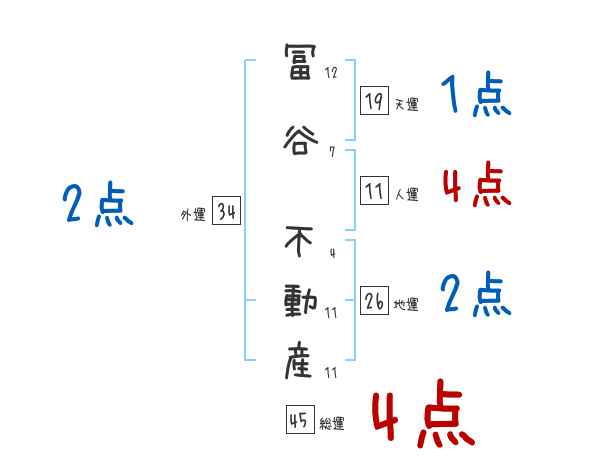 天運![]() | 冨谷不動産さんの天運は19画の1つ星!優れた才能を持ちますが、協調性が足りないことも。周りの人と協力する事を意識しましょう。 家系が持つ宿命的な運勢を表します。祖先から受け継いだ苗字ですので自分の力が及びません。家柄を象徴します。 |
