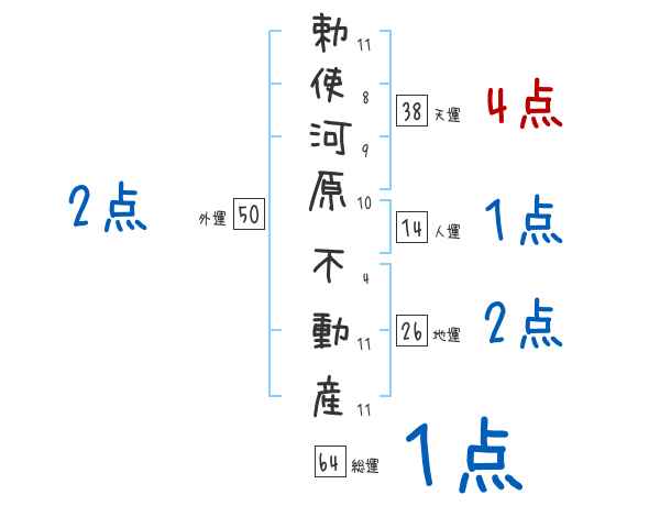 天運![]() | 勅使河原不動産さんの天運は38画の4つ星!温厚な性格で技術的な才能を発揮する。職人的な仕事に向いている。 家系が持つ宿命的な運勢を表します。祖先から受け継いだ苗字ですので自分の力が及びません。家柄を象徴します。 |